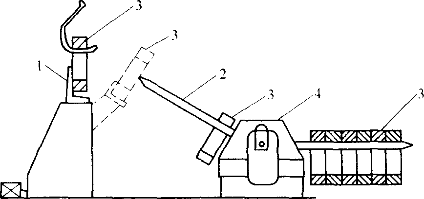 图1-2 用卸卷小车的盘卷卸卷装置示意图 1,卸卷小车 2,升降横杆 3,固定收集架 4,链条传动机构